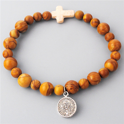 Bracelets chapelet de breloques pour femmes, perles ovales en bois, avec pierres précieuses, croix, articles religieux catholique, 6x8mm