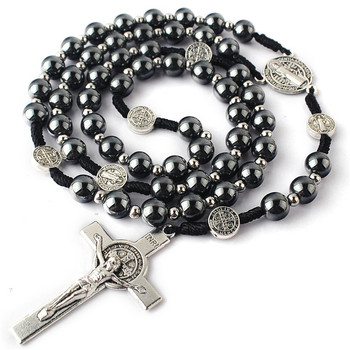 Công Giáo Crucifix Cầu Nguyện Vòng Cổ 8 Mét Hematit Hạt Với 4 Mét Thép Không Gỉ Hạt Mân Côi Vòng Cổ Với Dây Màu Đen