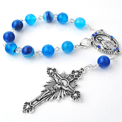 Quà Tặng 8Mm Blue Line Đá Mã Não Hạt Công Giáo Một Thập Kỷ Mân Côi Xe Với Virgin Mary Trung Tâm Huy Chương Với Diamond Stone